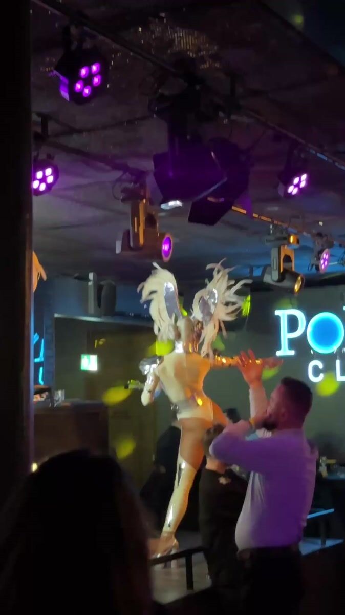 Costumed performers with feathered wings entertain nightclub crowd in Poland
