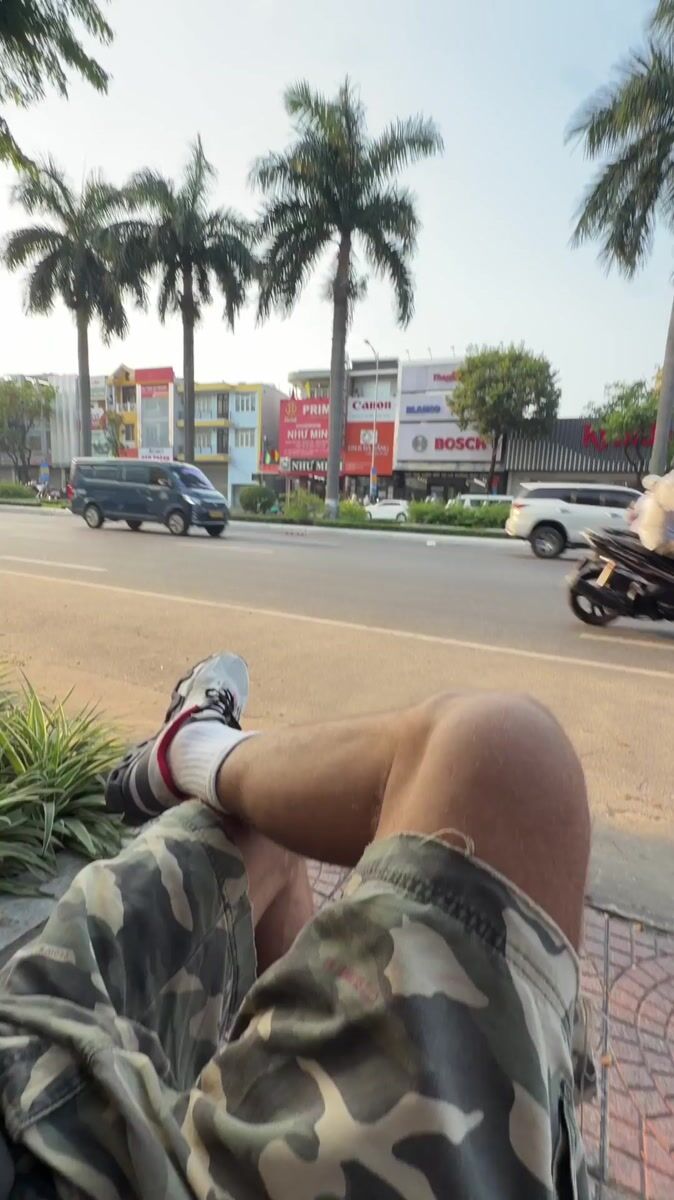 Topics: street rest, aircraft overhead, palm trees, urban life, transportation, public space, aviation, tropical, daily life, vietnam
