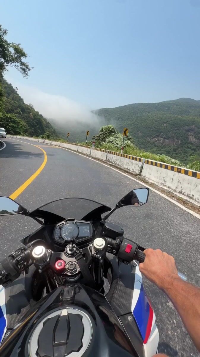 Topics: motorcycle riding, winding road, driver perspective, transportation, road travel, sunny weather, vietnam travel, urban mobility, daily commute, southeast asia
