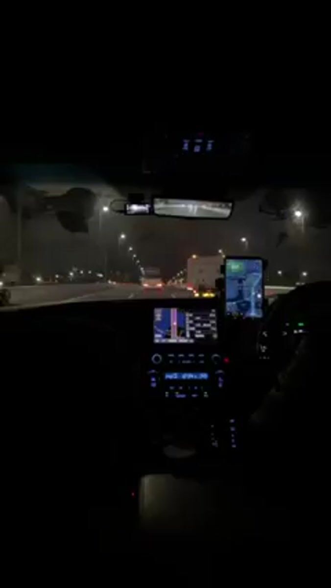 Topics: dashboard recording, highway driving, night view, vehicle interior, street lighting, automotive, transportation, urban, technology, daily life