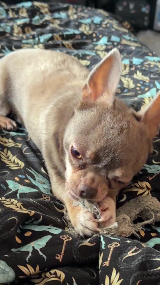 Topics: chihuahua, rope toy, pet owner, indoor pet, companion animal, domestic life, leisure, home, daily life, social