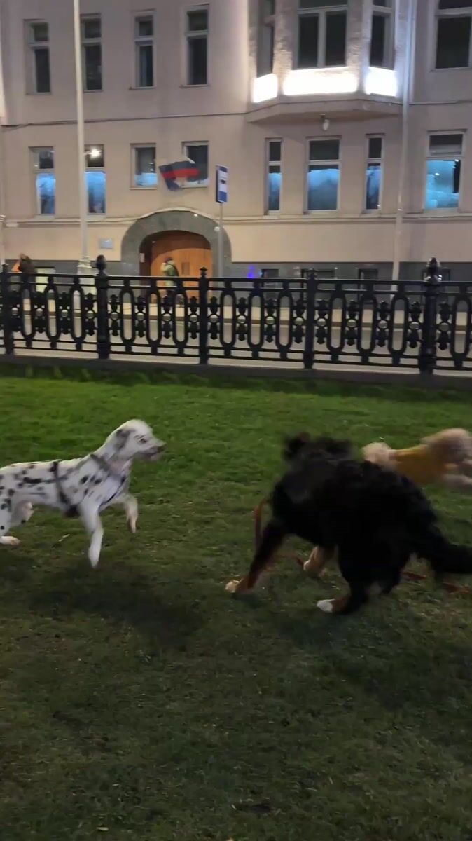 Three dogs play in grassy area near Moscow streetLocation: Moscow, Russia4/20/20261 sources from 2 citizen journalistsTopics: dog playing, dalmatian, bernese mountain dog, pet activity, urban park, evening scene, animal, social, urban, daily lifeSource MediaPhoto source: b8a59266Photo source: ebea4ae6