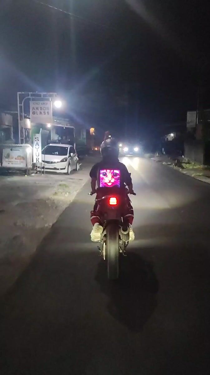 Motorcyclists travel roads near Ubud, one wearing glowing cat shirt