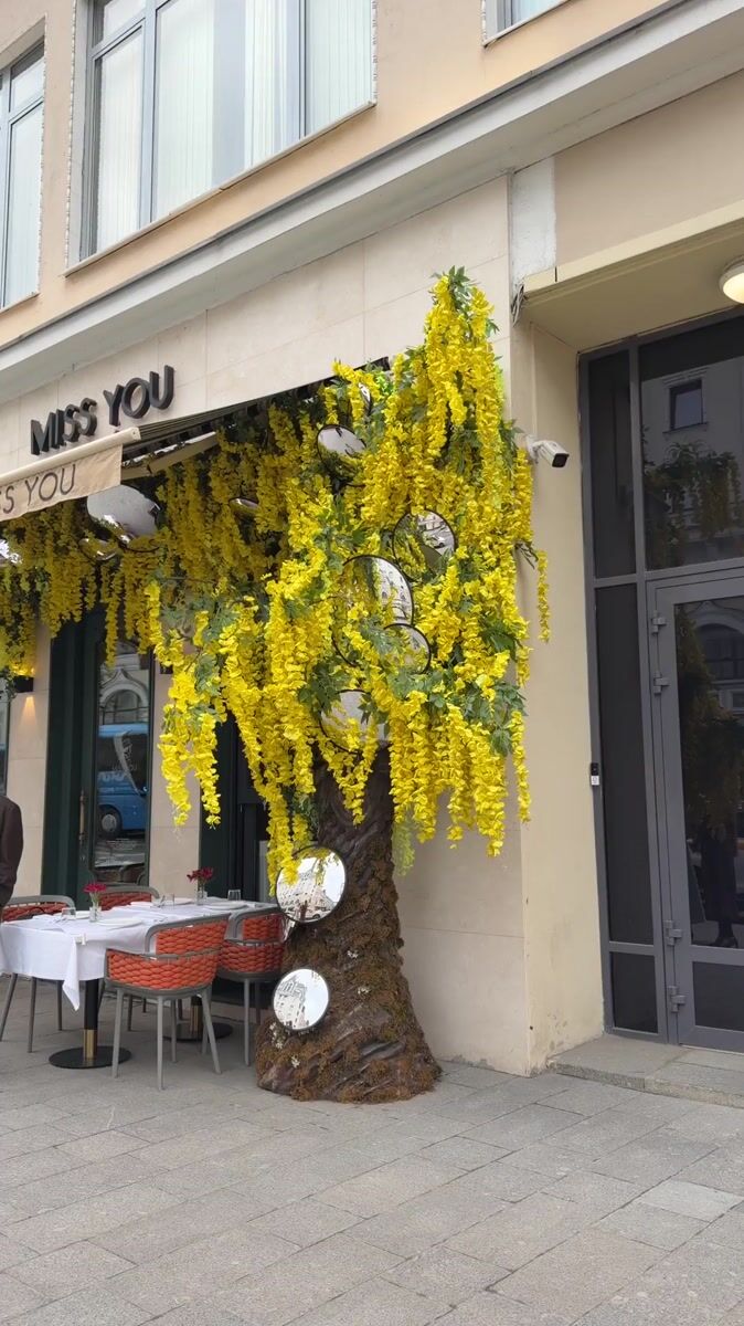 Topics: flower vendor, cafe dining, street commerce, shopping district, outdoor dining, retail activity, commercial area, urban life, daily life, social