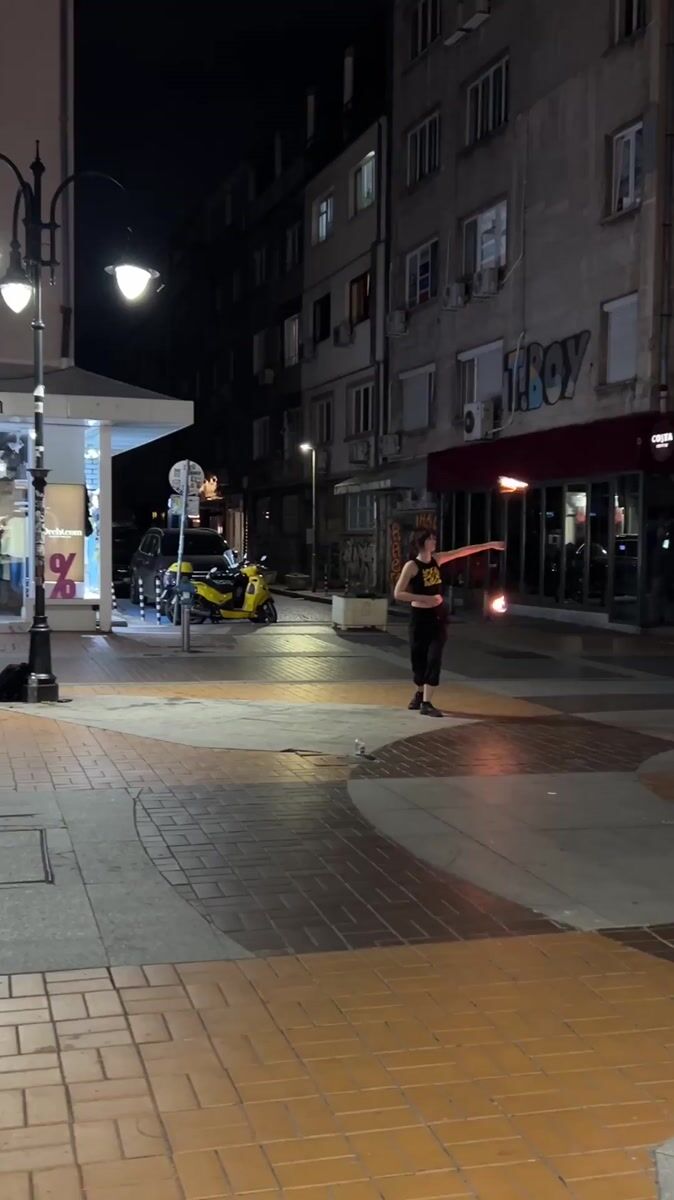 Topics: fire spinning, street performance, flaming batons, performance art, street entertainment, nightlife, urban culture, public space, entertainment, street art