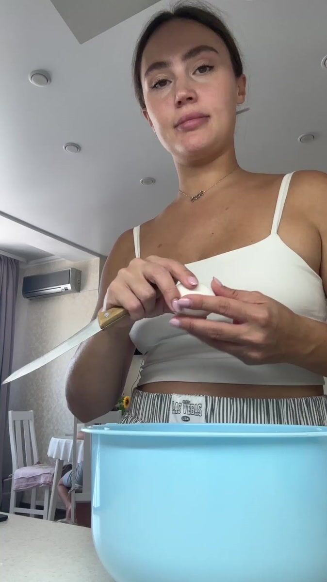 Woman cooks breakfast with baby present in Surgut kitchen