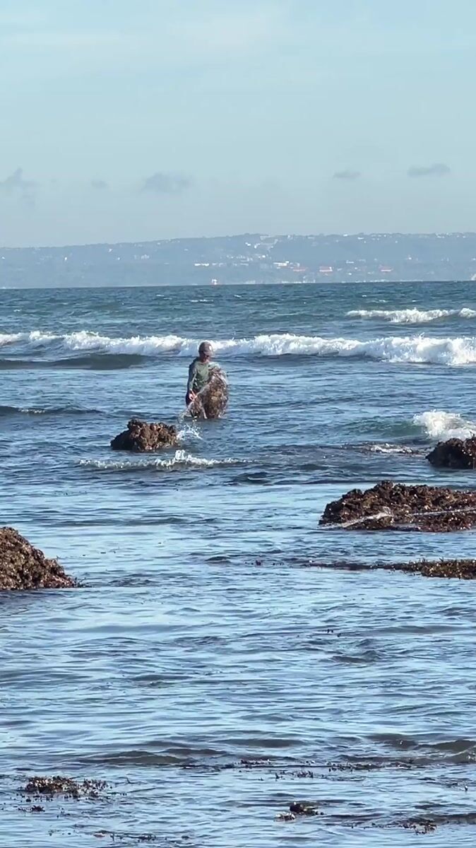 Topics: beach activities, handstand, rocky shoreline, swimming, recreation, morning scene, tourism, lifestyle, coastal, daily life