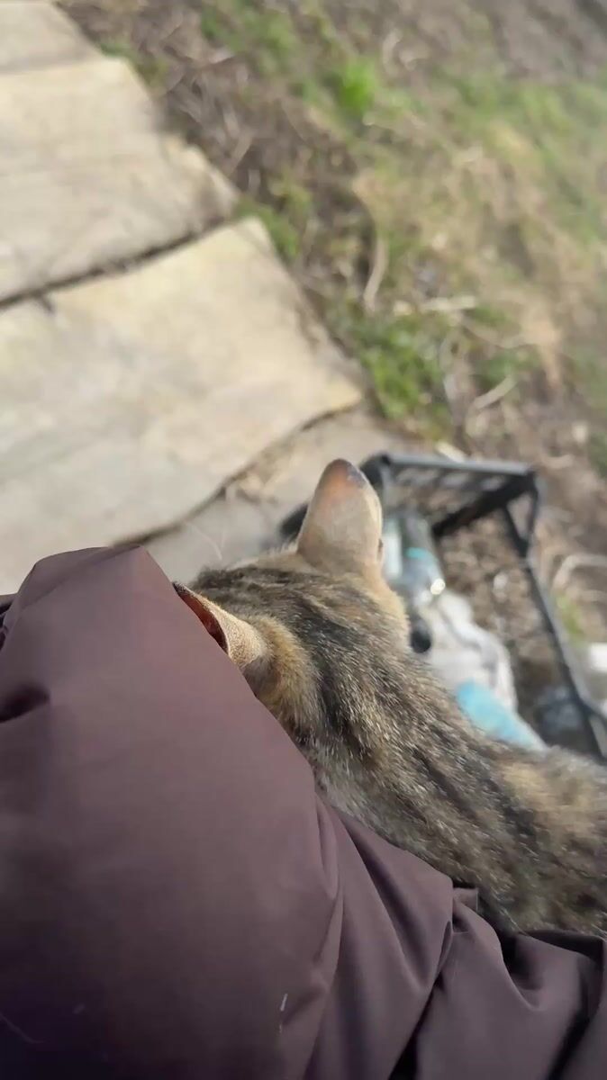 Topics: tabby cat, barbecue setup, backyard scene, rural life, domestic animal, outdoor cooking, quiet moment, countryside, daily life, rural