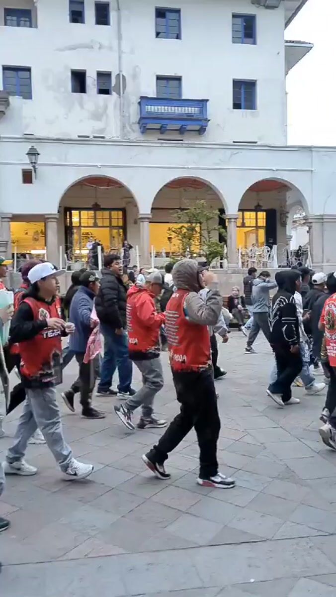 Topics: traditional dress, alpaca, religious statue, plaza dancing, street celebration, tourism, colonial architecture, cultural heritage, evening life, daily life