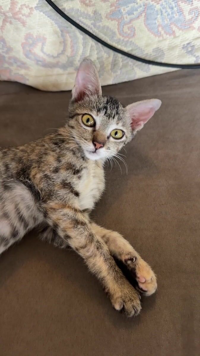 Topics: kitten petting, tabby cat, couch interaction, pet care, indoor scene, home environment, animal, domestic, lifestyle, daily life
