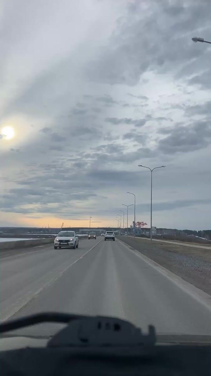 Topics: highway drive, early morning, vehicle interior, overcast sky, road travel, waterfront road, transportation, daily life, urban, russia