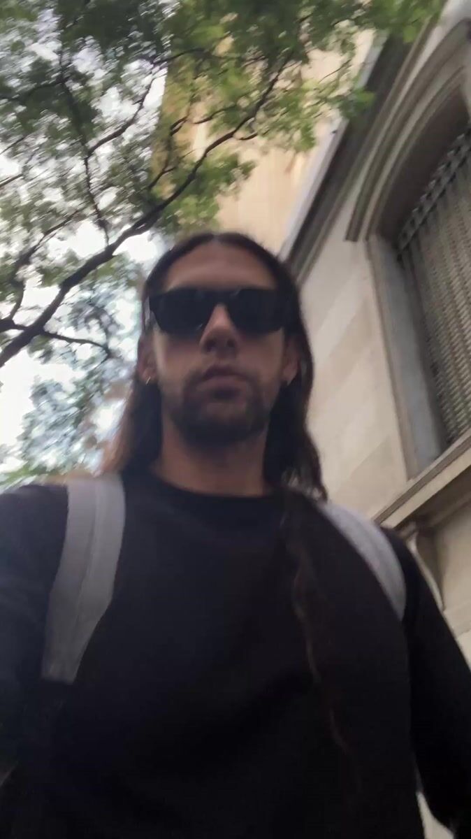 Man with backpack walks Buenos Aires sidewalk Friday evening