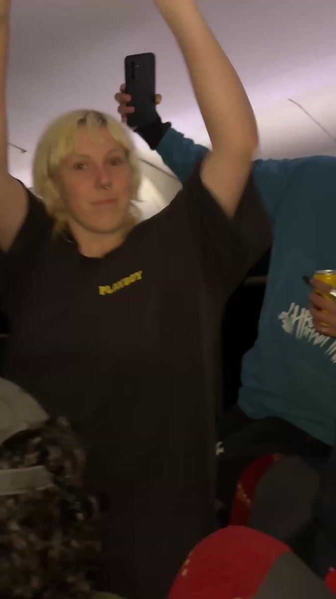 Topics: spontaneous dancing, vehicle interior, airplane cabin, nighttime activity, social interaction, public transport, entertainment, urban, travel, daily life