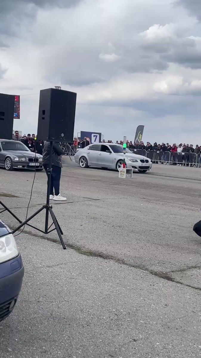 Crowd films SUV drag race preparation in Ostrovo Bulgaria