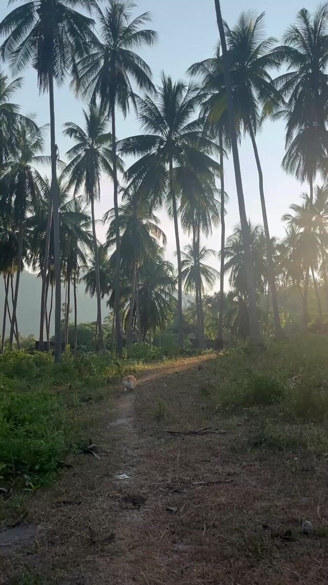 Topics: dirt path, palm trees, sunlight filtering, tropical vegetation, rural landscape, nature walk, outdoor, rural, nature, daily life
