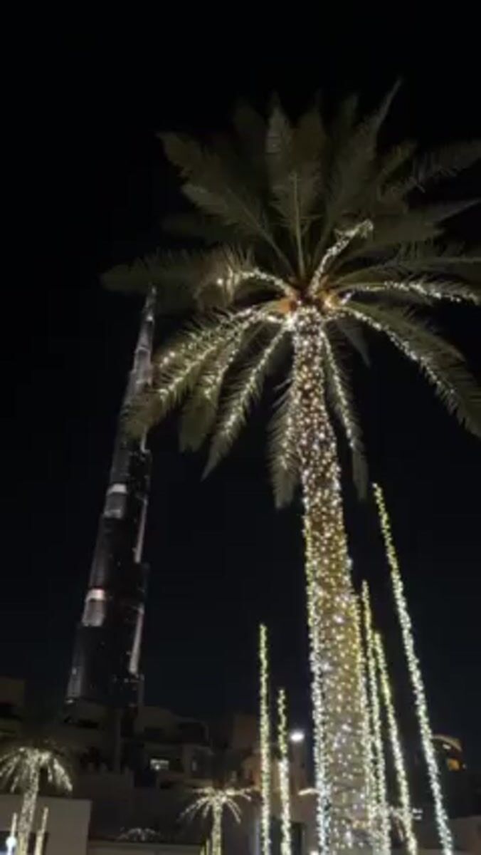 Topics: burj khalifa, palm trees, string lights, skyscraper, nighttime, architecture, urban, tourism, middle east, cityscape