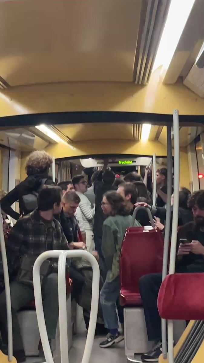 Topics: tram interior, crowded transit, evening commute, public transport, urban mobility, passenger travel, transportation, city life, urban, daily life