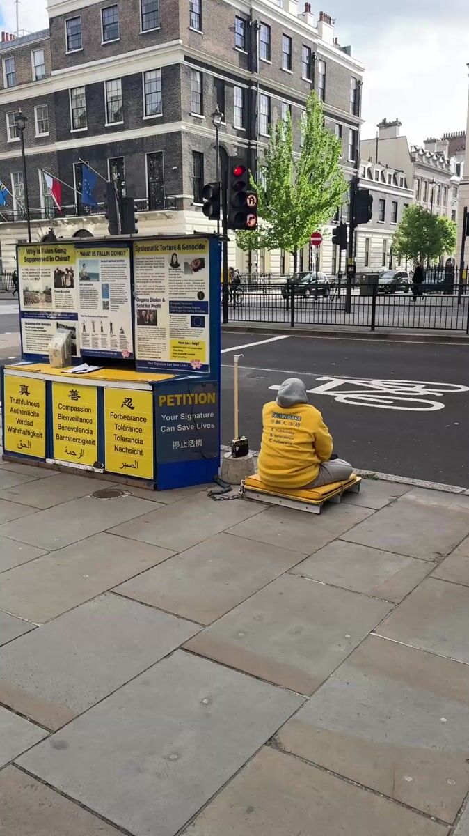 Person in Falun Dafa sweatshirt sits on London sidewalk