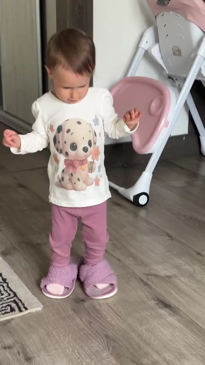 Topics: dalmatian shirt, toddler standing, wooden floor, child development, indoor scene, family moment, childhood, domestic, daily life, personal