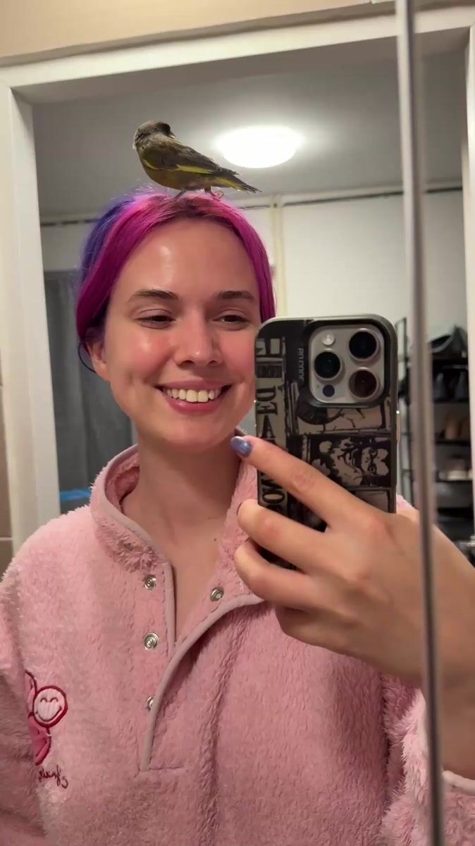 Woman Takes Bathroom Selfies With Bird Perched On Head