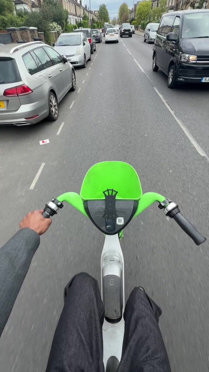 Rider uses Lime e-scooter on London residential street