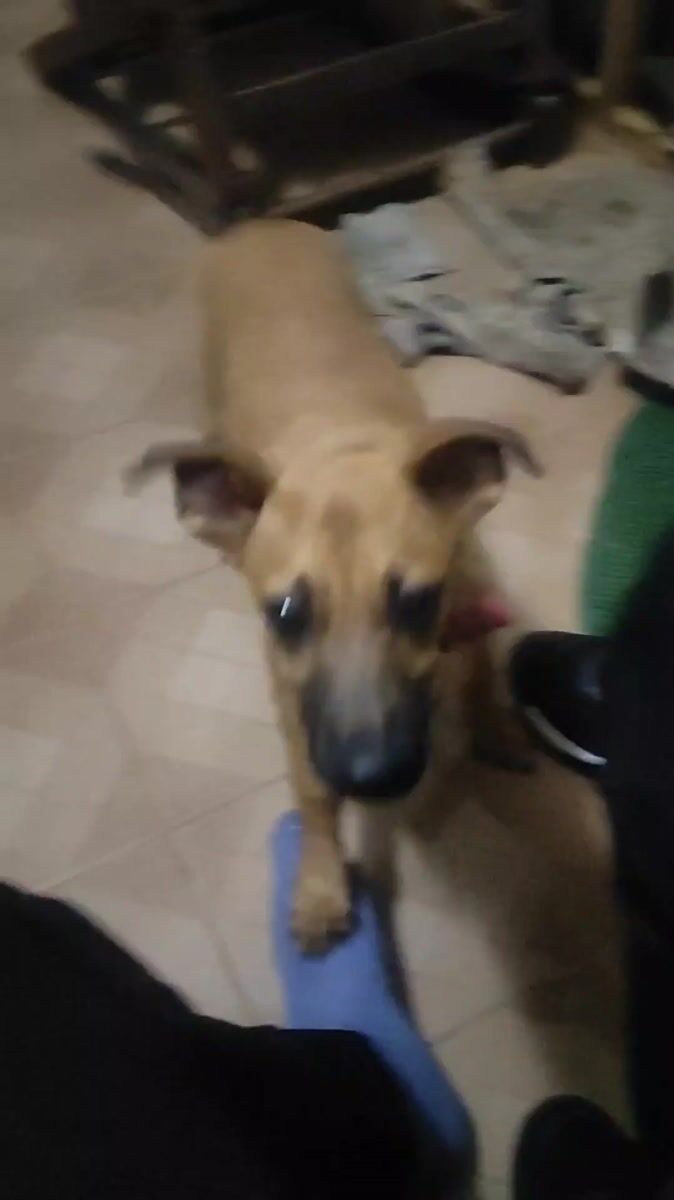 Topics: red collar dog, indoor play, tan dog, pet behavior, home interior, animal, domestic, family life, daily life, venezuela