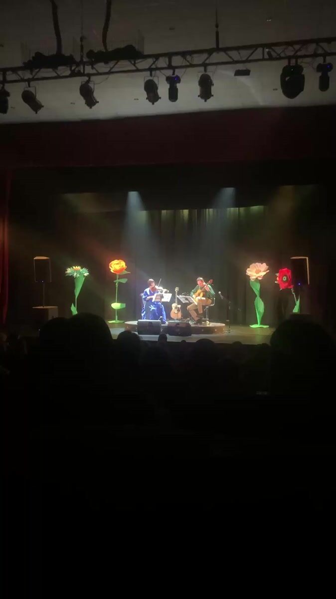 Topics: violin performance, bronze statue, scrambled eggs, stage setup, musical duo, street art, cultural event, food photography, urban life, daily life