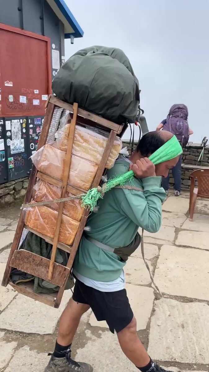 Topics: mountain porter, hiking injury, pack animal, stone pathway, mountain hiking, foggy weather, rural transport, mountain life, outdoor activity, daily life