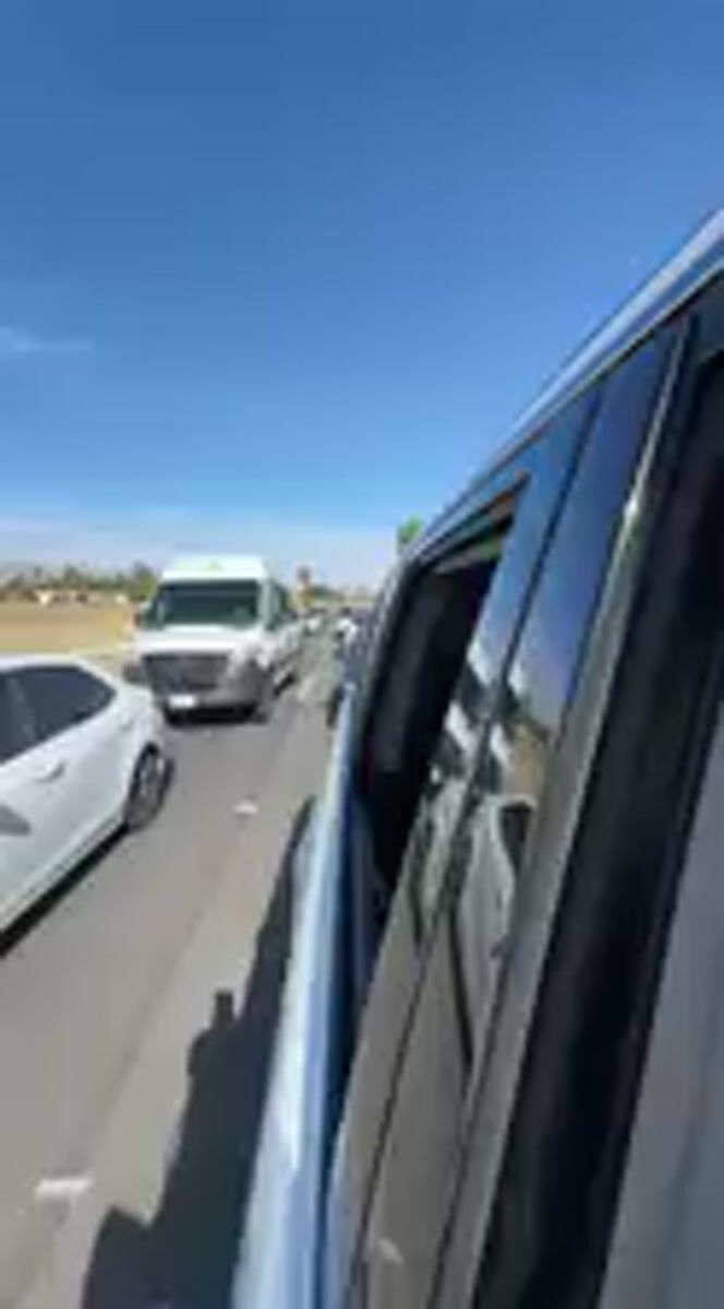 Topics: car hanging, gold dress, traffic incident, reckless behavior, vehicle stunt, public display, road safety, social media, urban, daily life