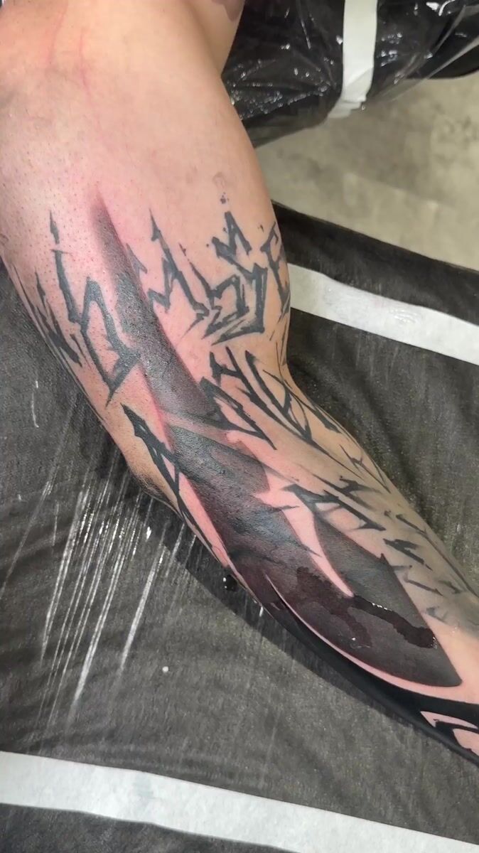 Person shows off fresh abstract forearm tattoo with bold geometric design