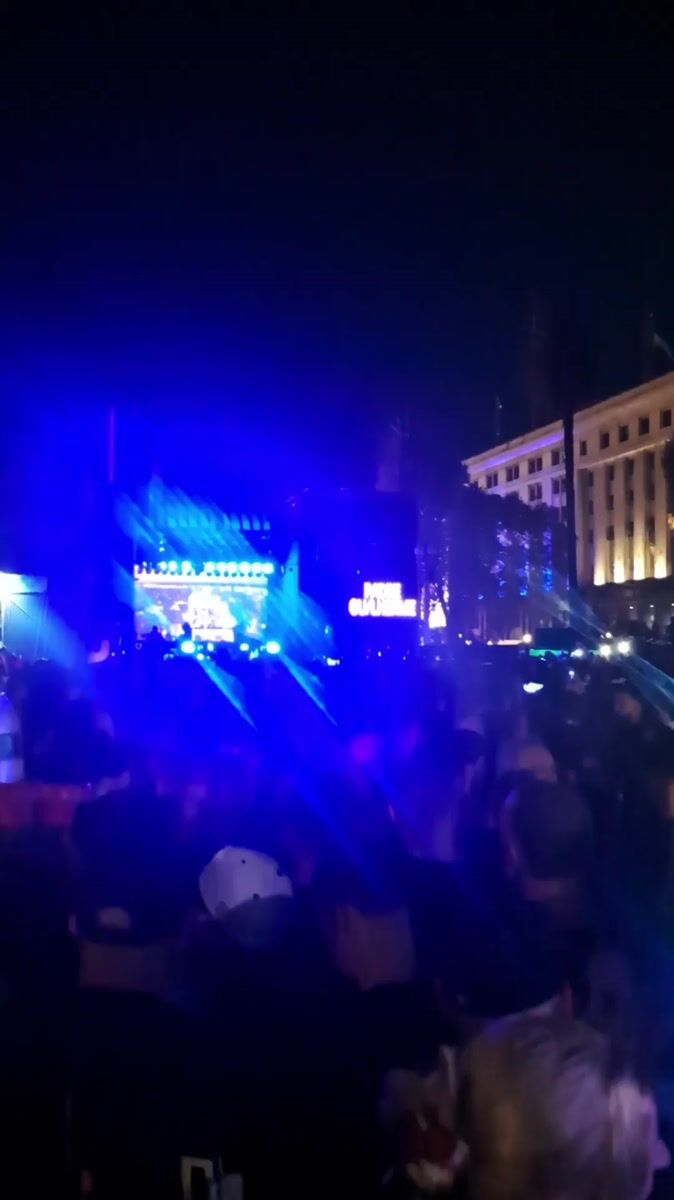 Topics: outdoor concert, stage lighting, blue lights, nighttime event, crowd gathering, entertainment, music, nightlife, social, urban