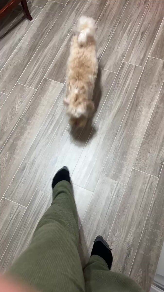 Small dog plays around owner's feet in Belgrade home