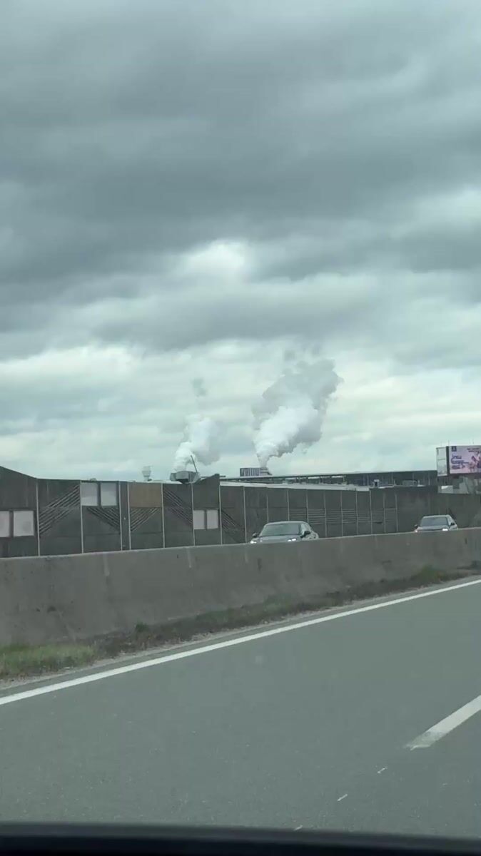 Motorist films industrial smokestacks from highway near Wals, Austria