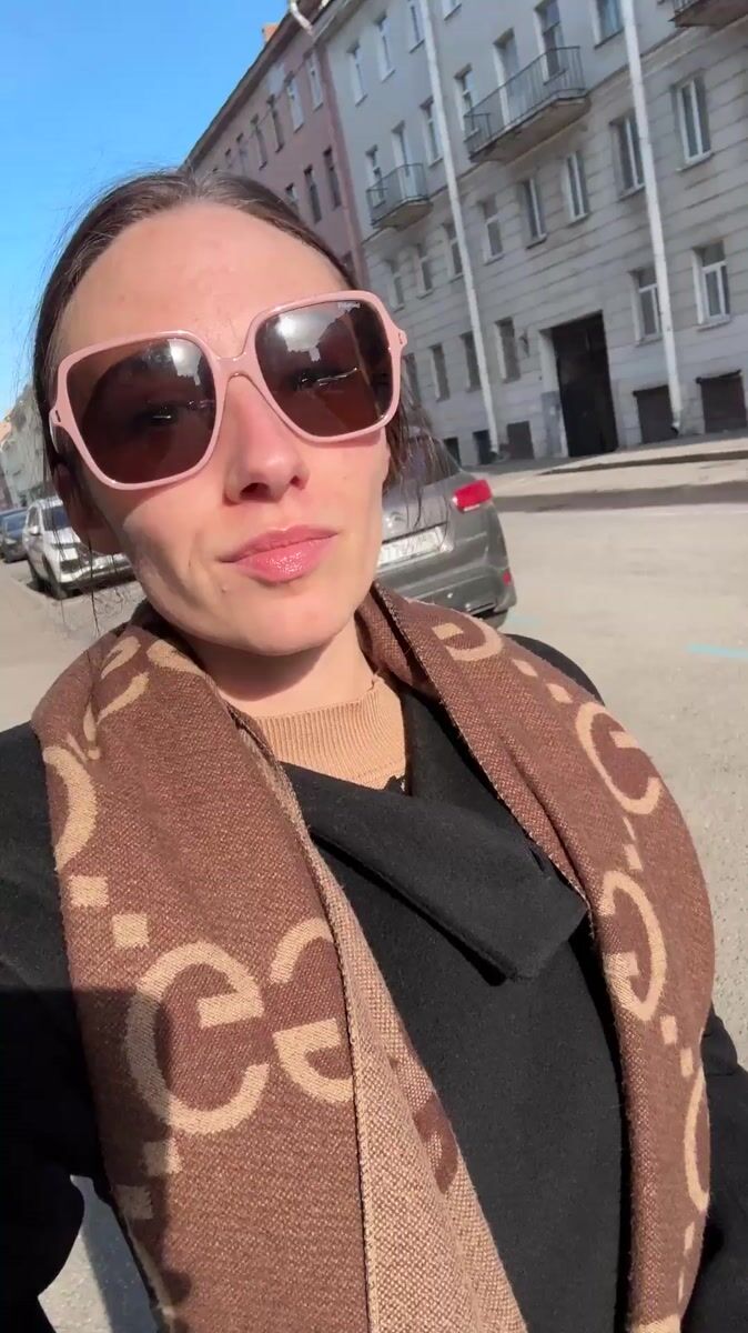 Topics: designer accessories, gucci scarf, pink sunglasses, street portrait, fashion, sunny day, urban lifestyle, daily life, social, street