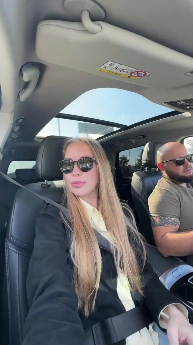 Topics: car passenger, blonde woman, selfie, road trip, daytime travel, vehicle interior, transportation, travel, daily life, social