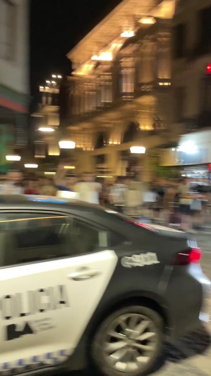 Topics: police escort, street celebration, night crowd, arrest, nighttime, street gathering, law enforcement, urban, social, public safety