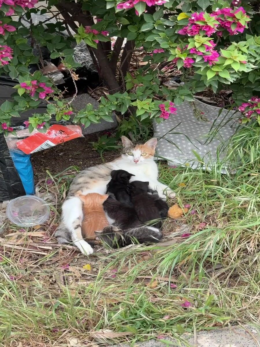 Calico cat nurses kittens in Kiryat Motzkin grass