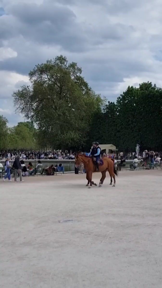 Topics: mounted police, street music, tuileries garden, park leisure, spring afternoon, public space, outdoor relaxation, urban life, social, daily life