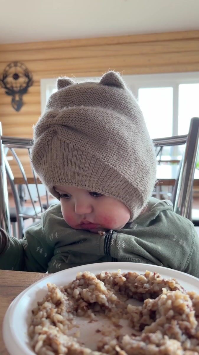 Topics: baby feeding, knitted hat, high chair, mealtime, infant care, domestic scene, village life, family, rural, daily life