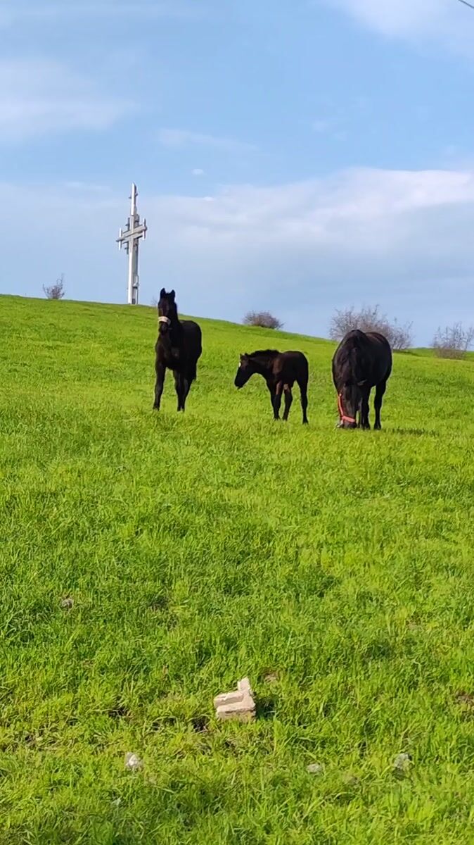 Topics: black horses, grazing, hillside, pastoral, livestock, countryside, nature, outdoor, animal, rural