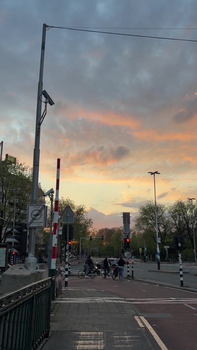 Topics: canal reflection, evening cycling, dusk traffic, street intersection, urban waterway, twilight, transportation, cityscape, daily life, european