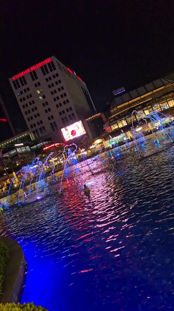 Illuminated fountain and selfie-taking ape statue documented in Ataşehir