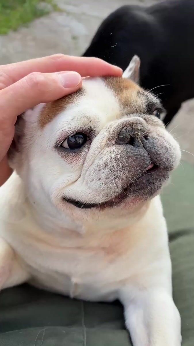 Topics: french bulldog, dog petting, twig play, pet interaction, dog behavior, animal care, pets, companionship, daily life, domestic