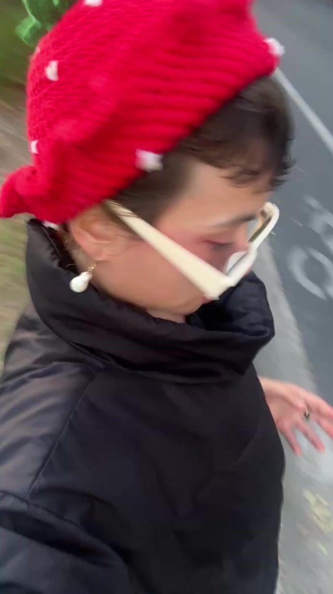 Topics: strawberry hat, self filming, knitted accessory, street walking, nighttime activity, fashion accessory, social media, urban, personal, daily life