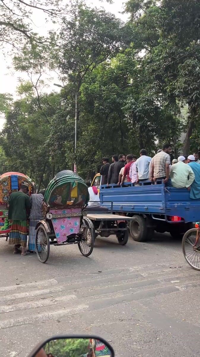 Topics: rickshaw, street scene, urban life, transportation, daily life, neighborhood, tree lined, bustling, urban, social