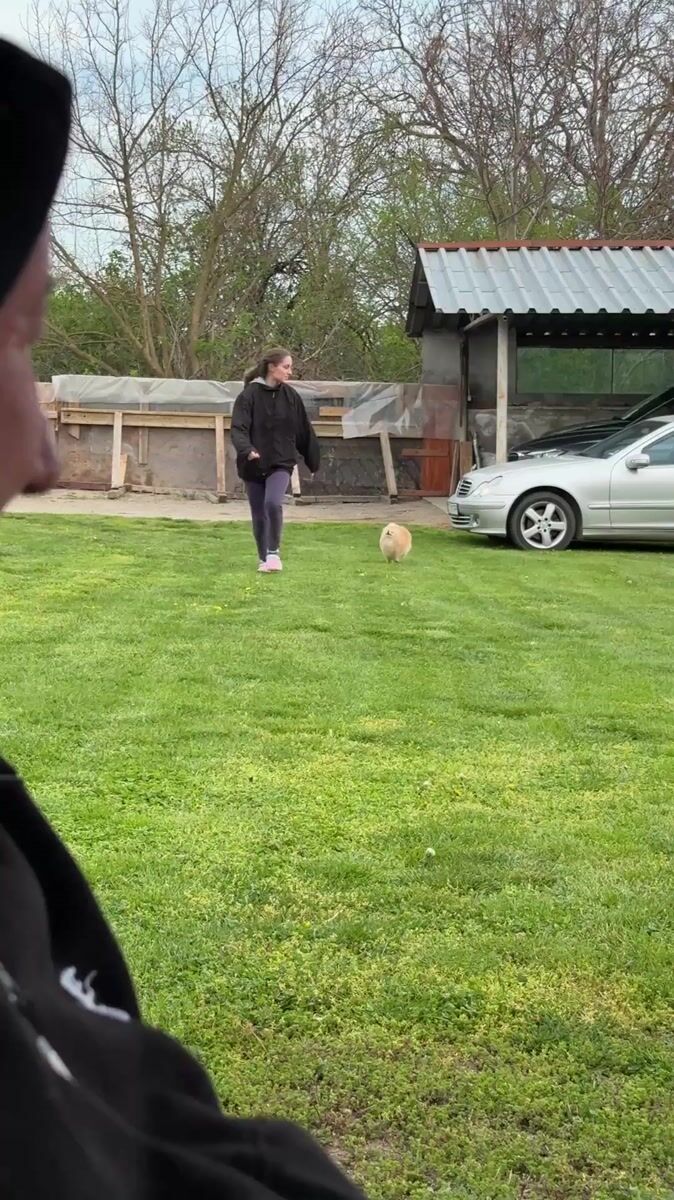 Woman chases Pomeranian dog across backyard in Bulgarian village