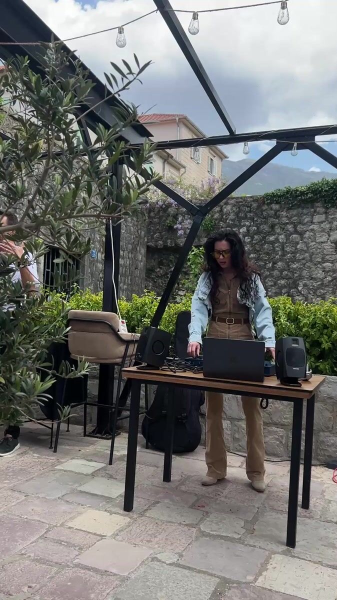 Woman DJs outdoors with laptop setup in Dobrota, Montenegro