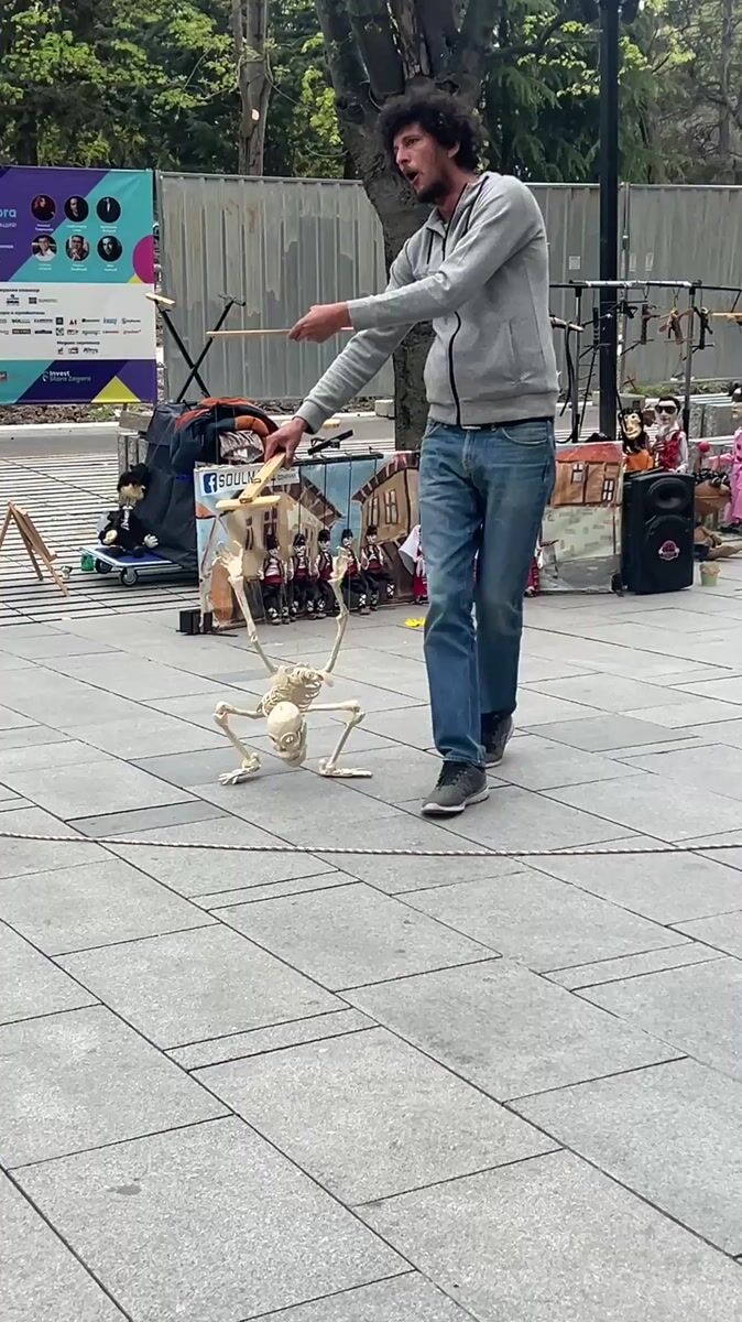 Street performer operates skeleton puppet in Stara Zagora park