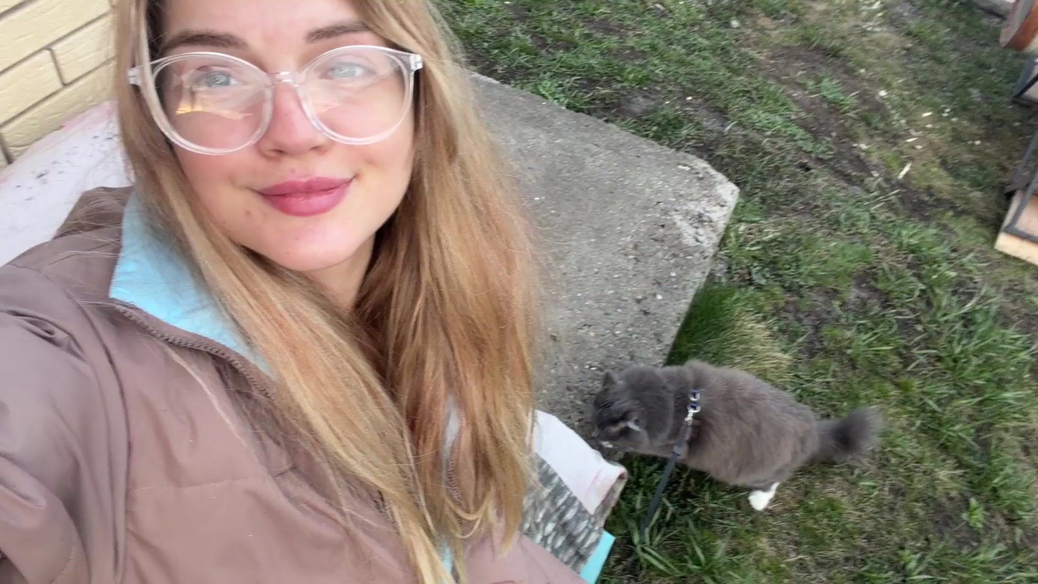 Topics: cat leash, selfie filming, pet training, outdoor photography, residential yard, social media, pet care, daily life, rural, domestic