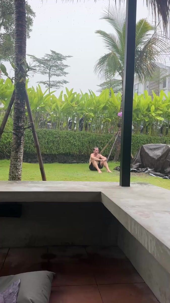 Topics: rain shower, selfie video, tropical garden, outdoor activity, personal moment, weather, social media, lifestyle, daily life, indonesia